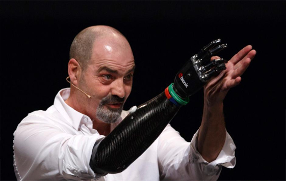 當地時(shí)間3月13日,西班牙塞維利亞,西班牙男子Nigel Ackland佩戴著(zhù)自己的肌電(myoelectric)假肢進(jìn)行演講。Nigel Ackland原本是一名熔煉工,一次事故使他不得不進(jìn)行截肢手術(shù),裝上了肌電假肢。圖為Nigel Ackland在演講中。